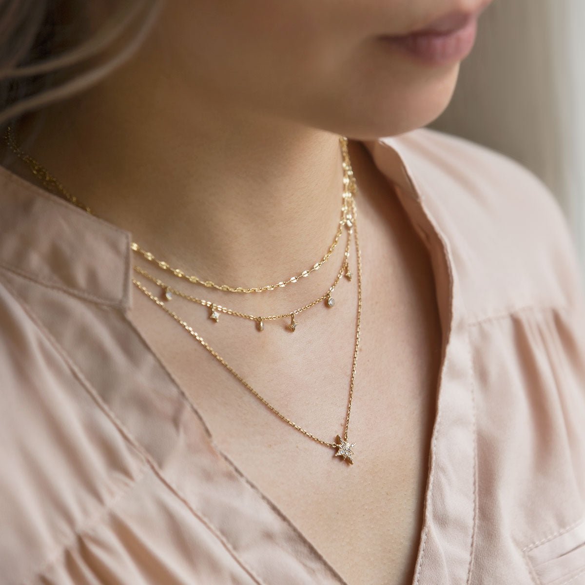 Our bestselling celestial-inspired gold layered necklace features delicate chains with star charms and crystal accents for a radiant look. Our O Collection patented connectors let you mix. match. or wear each separately.